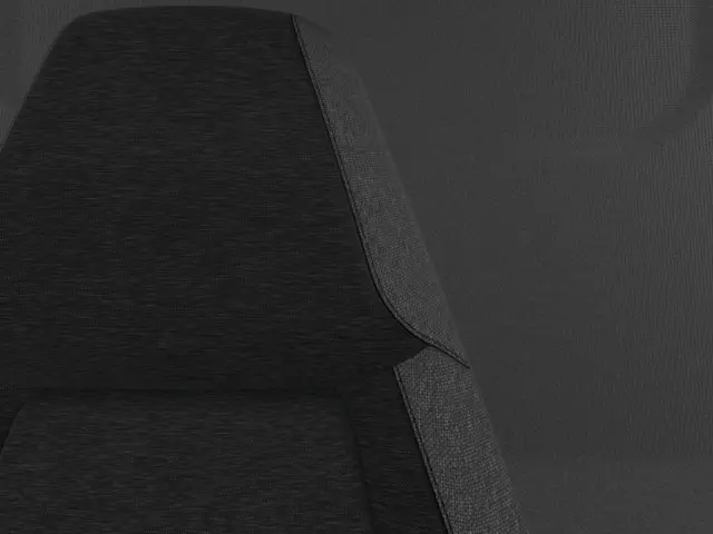- Stoffen stoelbekleding in gemêleerd donkergrijs met donkergrijze stiksels, lichtgrijze baan op de buitenzijde van de stoelen en versterkte kunstlederen wangen voor de bestuurdersstoel